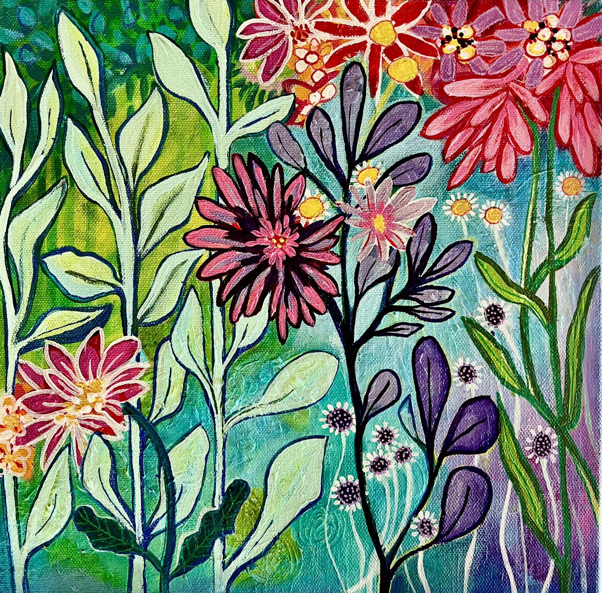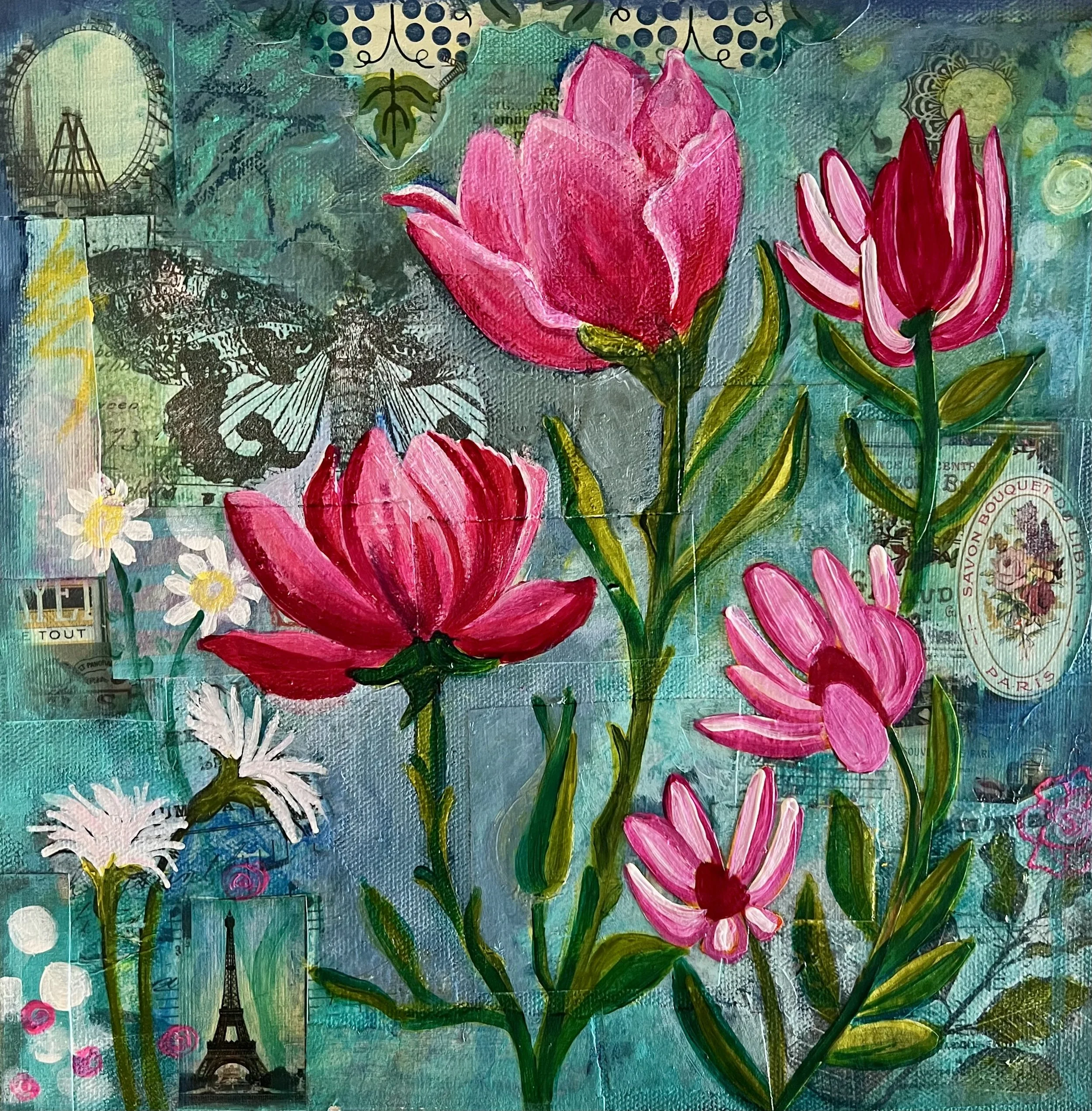 Many artists paint with a limited palette. They only use certain colors and mix whatever they need with those colors.As a lover of color, I can never have too many colors to chose from on my palette. With each new painting I realized I only use a handful of colors in each painting. To stretch my skills and learn something new, I decided to try out this limited palette idea. That is how Blue came to be. I have turquoise blue, very dark blue, white, pink and green, 5 colors, all on the cool side. This was a valuable lesson that demonstrated the benefit of understanding color and the skill of how to use it. And it was fun!