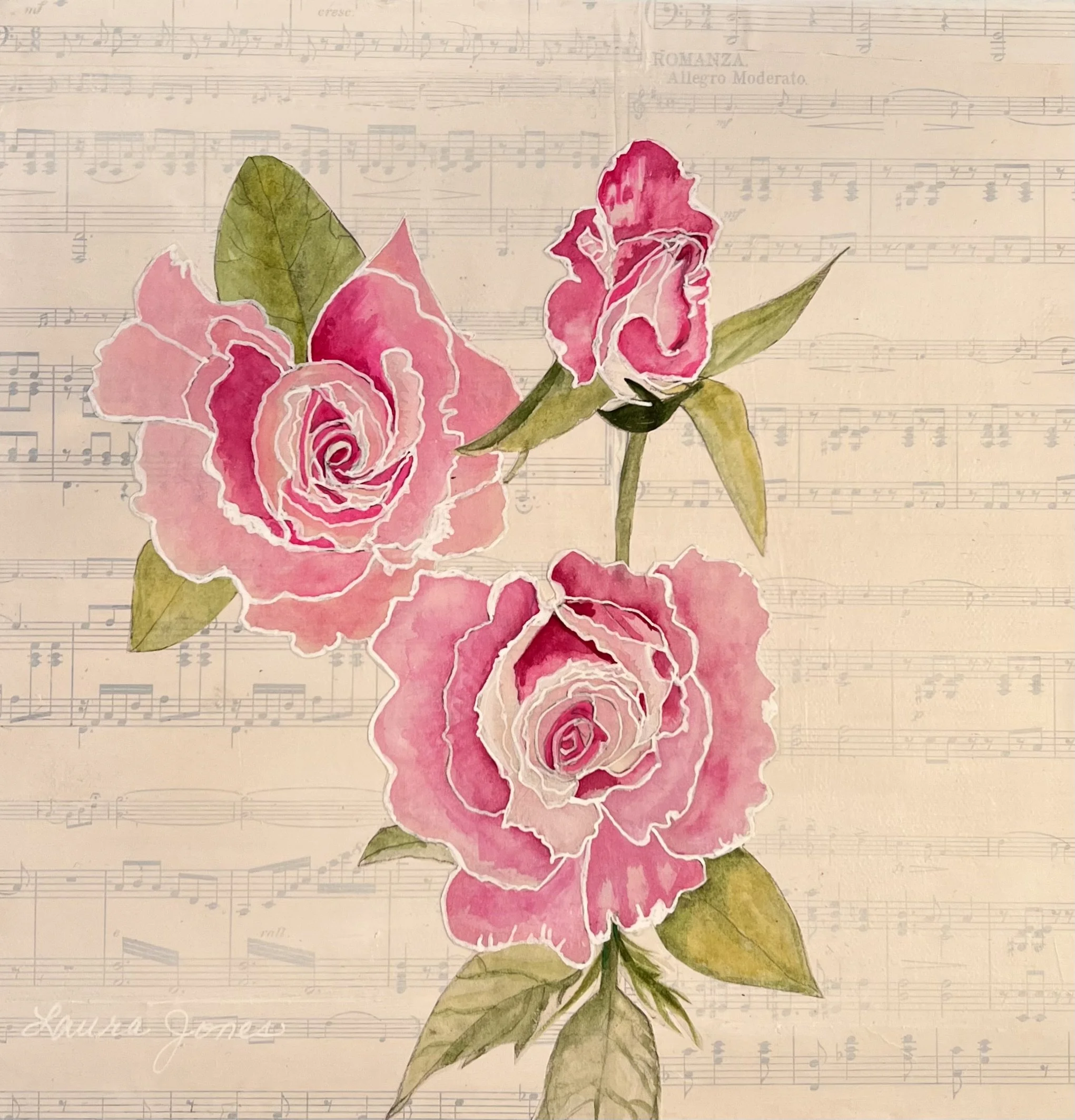 Vintage music paper and watercolor bring simplicity to these roses on. The vintage music paper was applied to the canvas and the painting applied over the music paper.