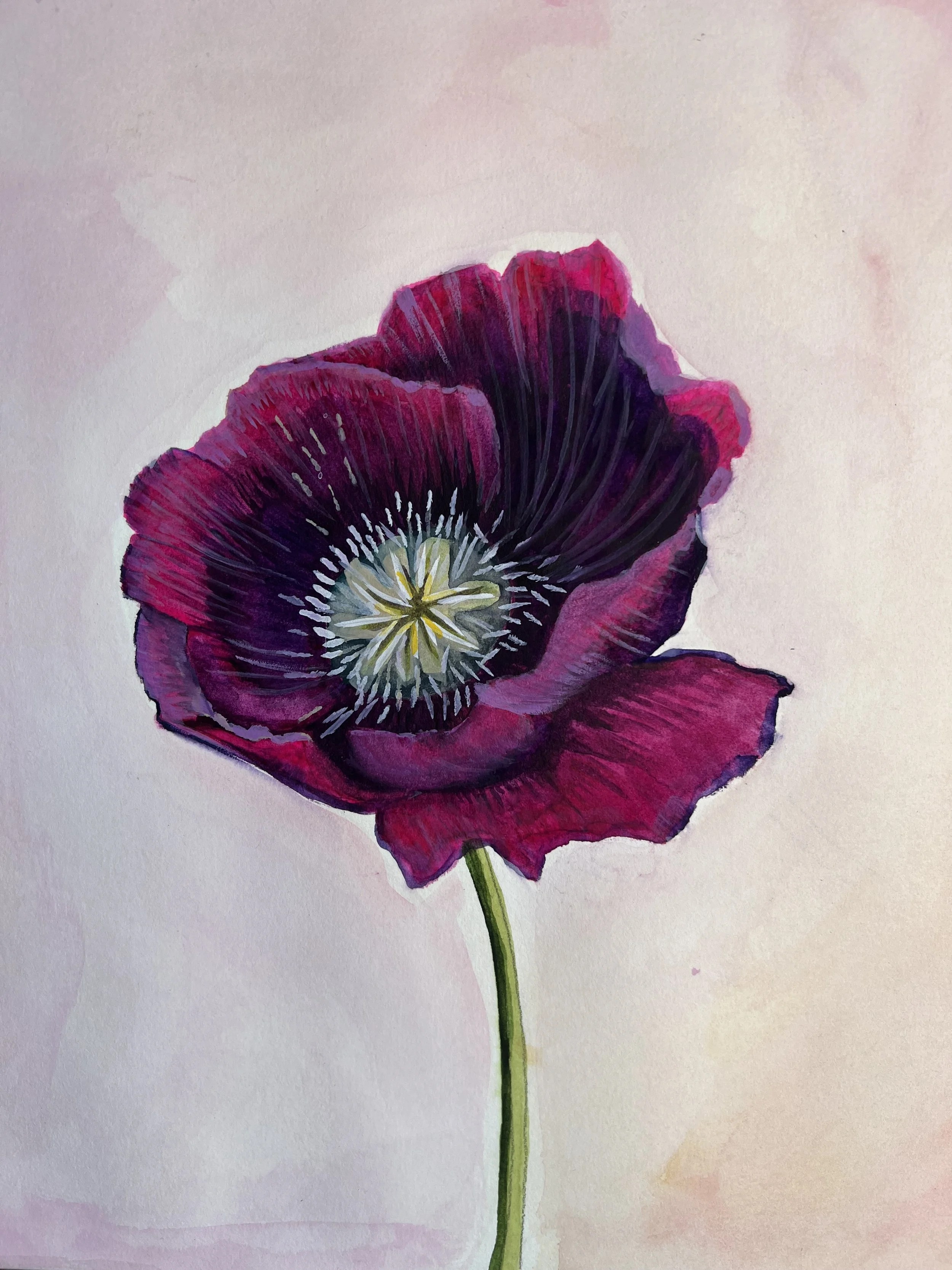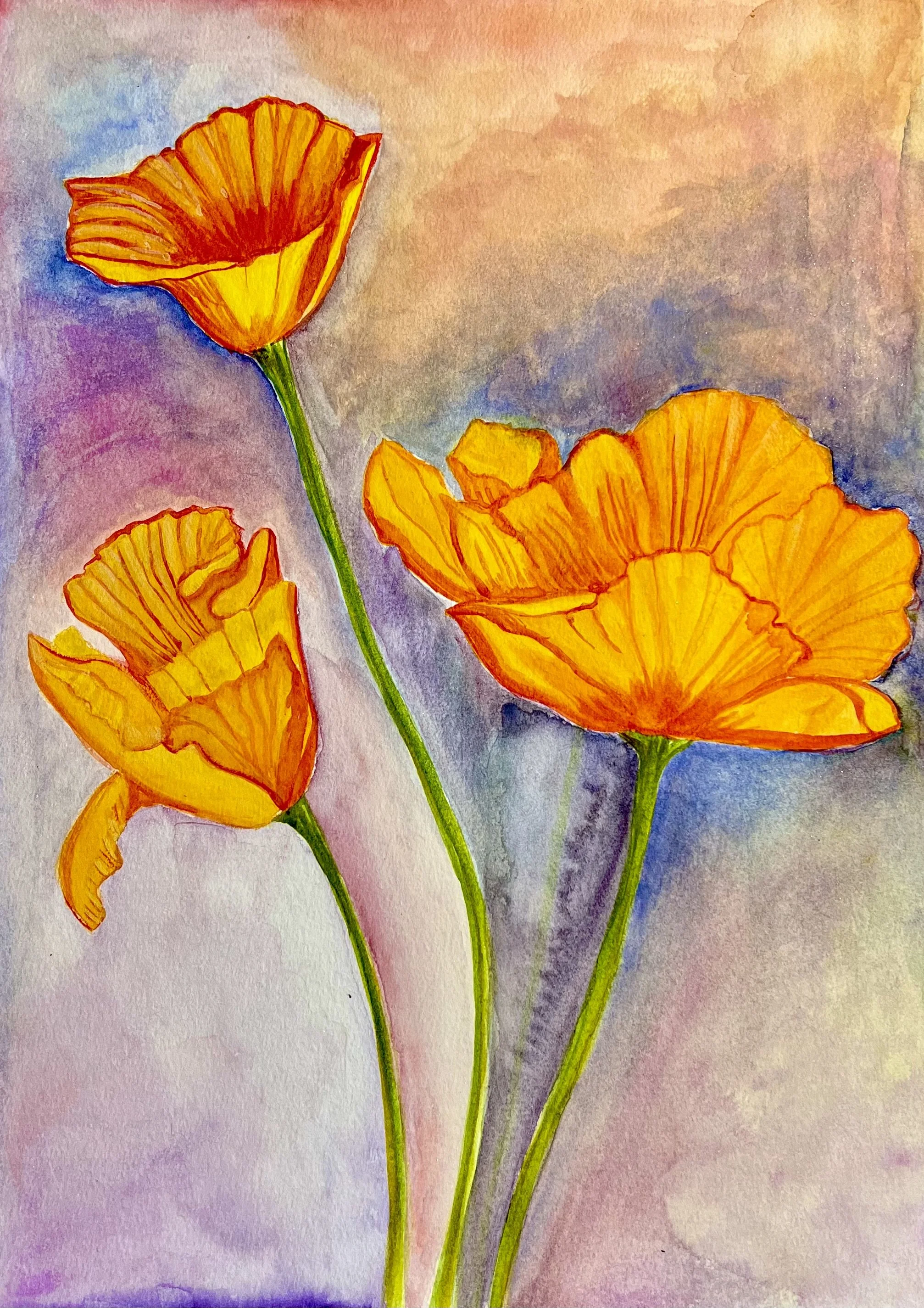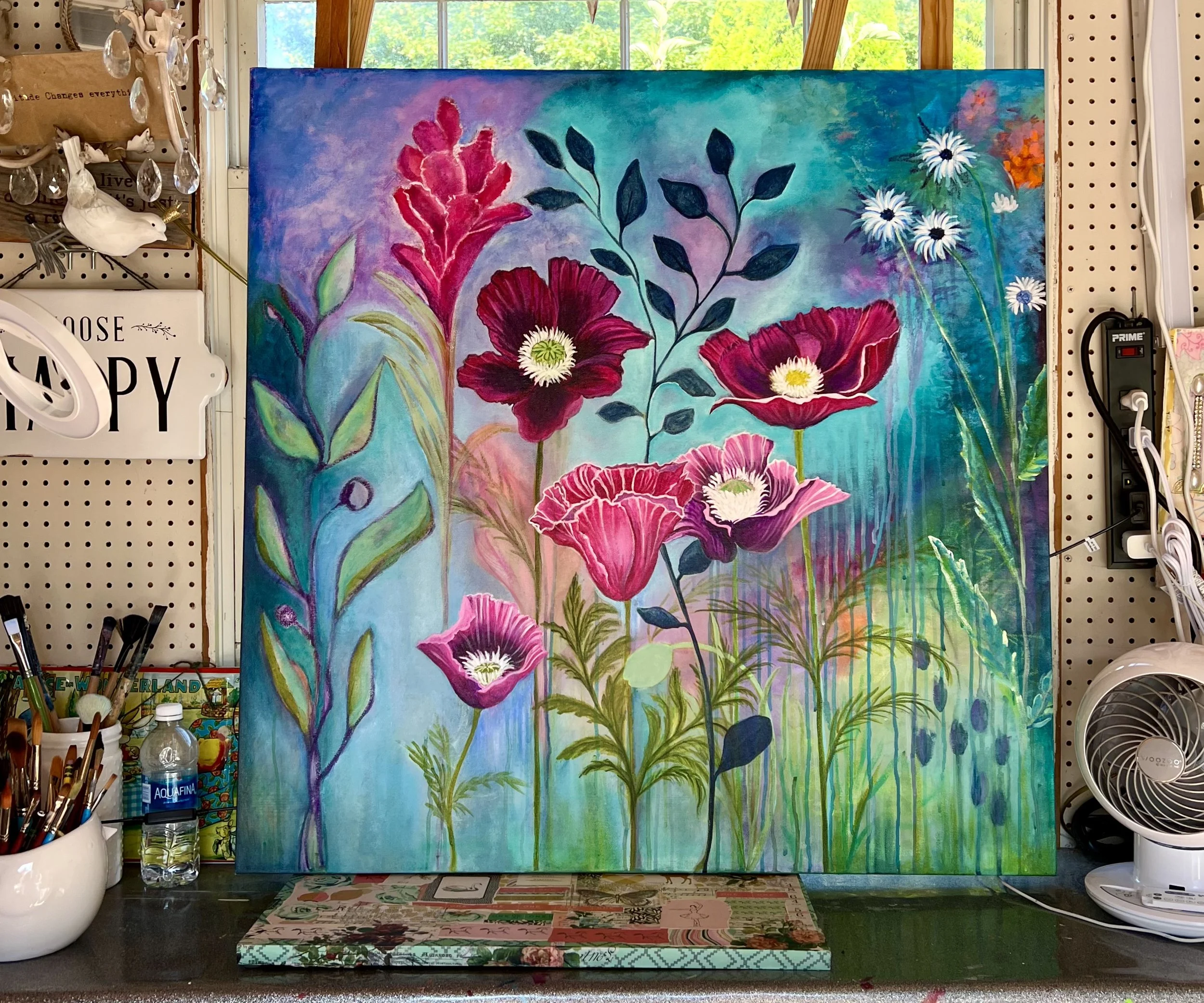 Even though I have been creative ever since I can remember I don’t have a lot of “art school” training. I’m mostly self-taught. My learning has been through trying new things.. Sometimes that is the long way around but sooner or later I get to a place I love. I have taken lots of art classes with artists whose work resonated with me.and I’m thankful to the generous artists who have shared their creativity and artistry. Every artist is different in how they approach their craft and I have been inspired by them all. These floral studies have helped me take watercolor flowers and translate it it into acrylic flower paintings. Learning watercolor has been a challenge and broadened my scope as an artist. It has also given me a deep appreciation for all the watercolor artists who make it look easy. All of the flower studies helped me to create the Poppies Painting.