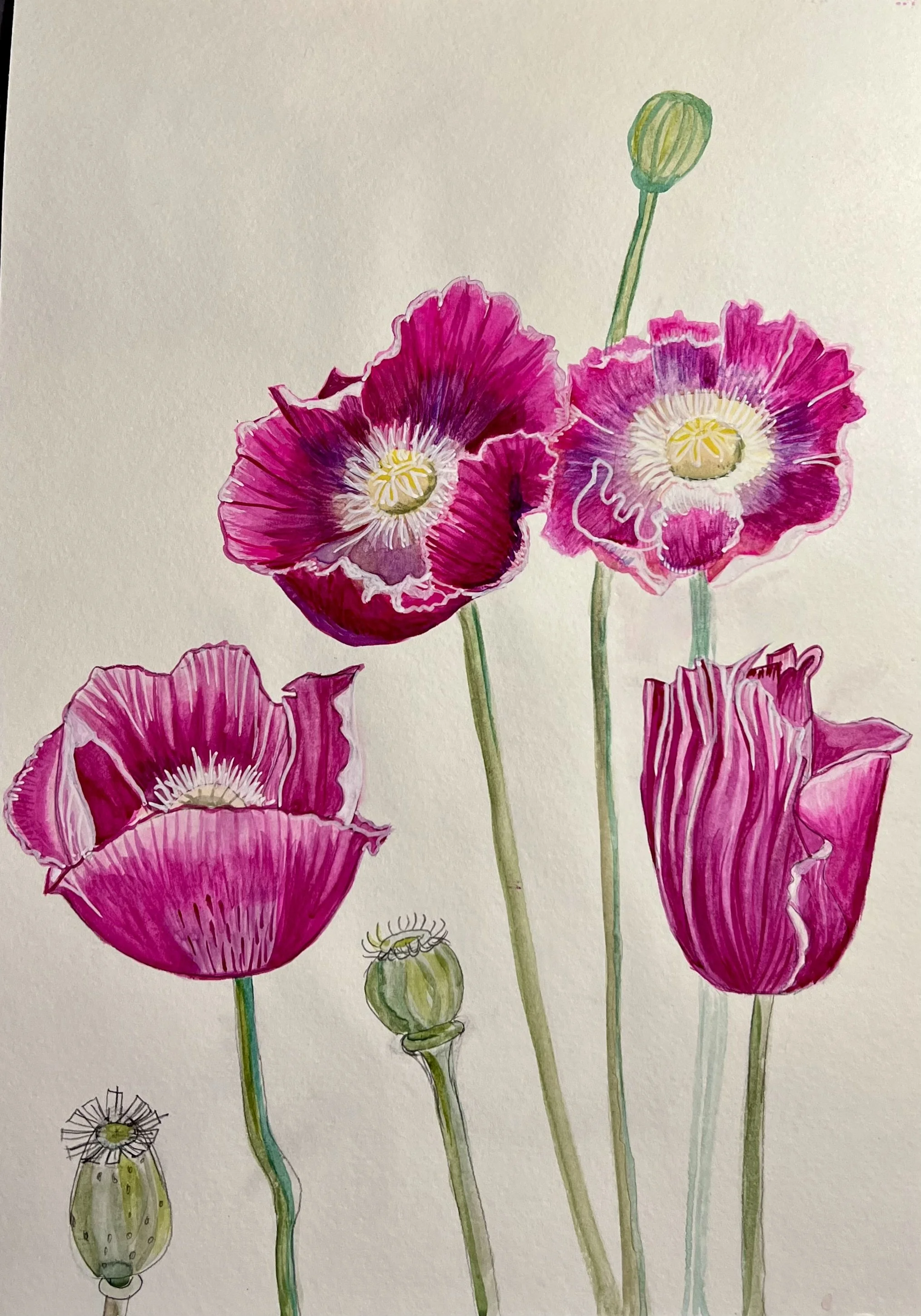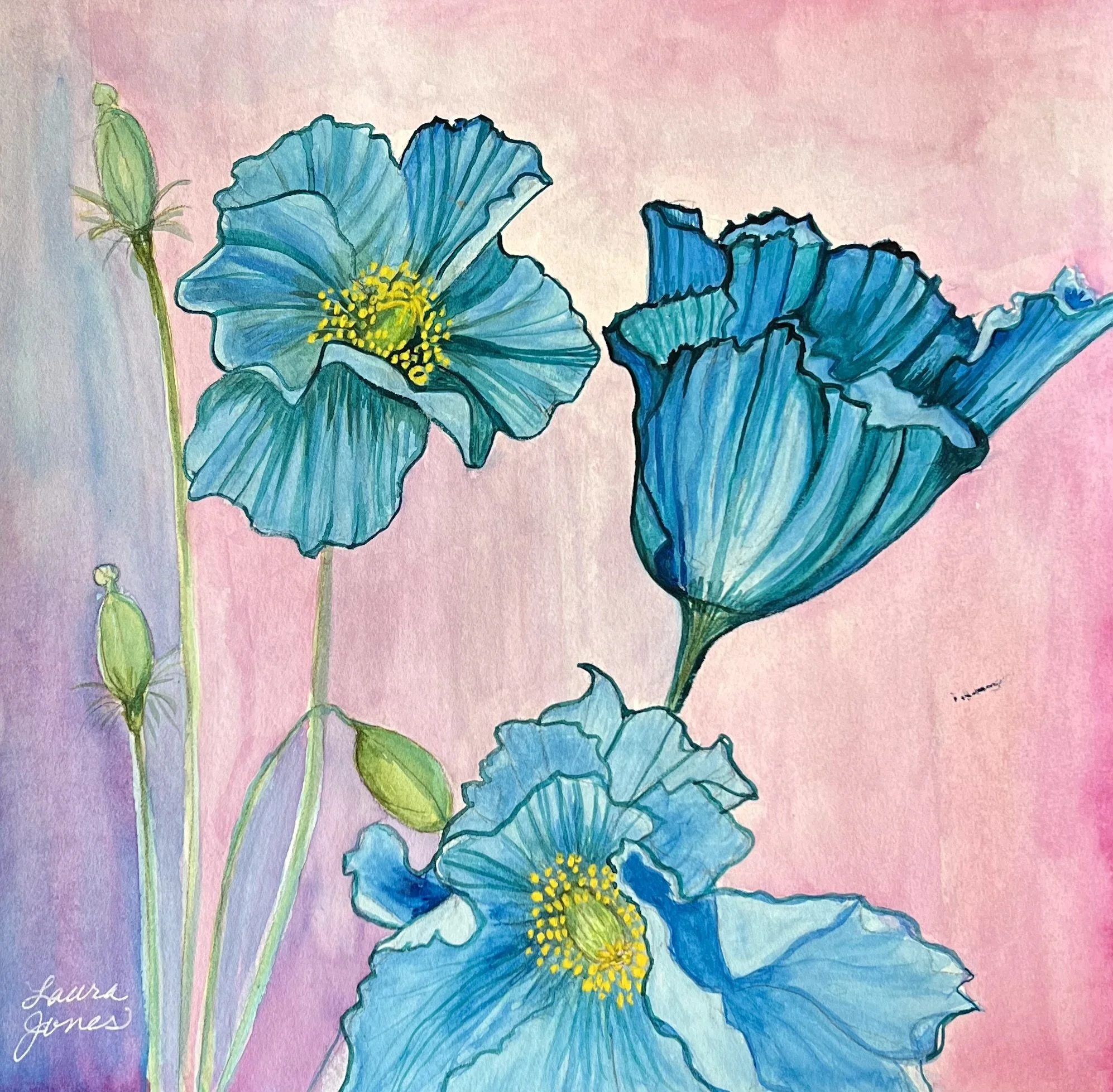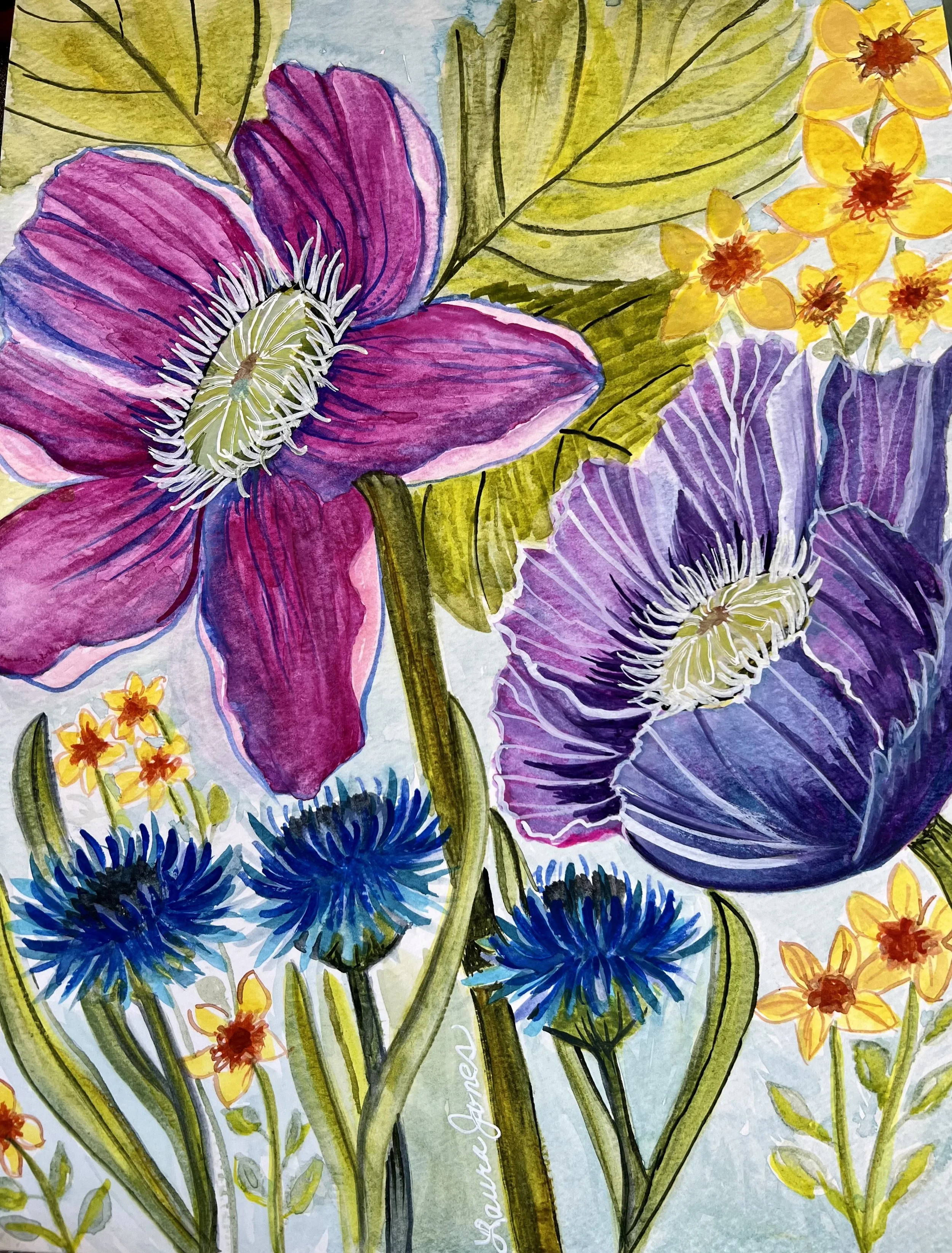 Even though I have been creative ever since I can remember I don’t have a lot of “art school” training. I’m mostly self-taught. My learning has been through trying new things.. Sometimes that is the long way around but sooner or later I get to a place I love. I have taken lots of art classes with artists whose work resonated with me.and I’m thankful to the generous artists who have shared their creativity and artistry. Every artist is different in how they approach their craft and I have been inspired by them all. These floral studies have helped me take watercolor flowers and translate it it into acrylic flower paintings. Learning watercolor has been a challenge and broadened my scope as an artist. It has also given me a deep appreciation for all the watercolor artists who make it look easy. All of the flower studies helped me to create the Poppies Painting.