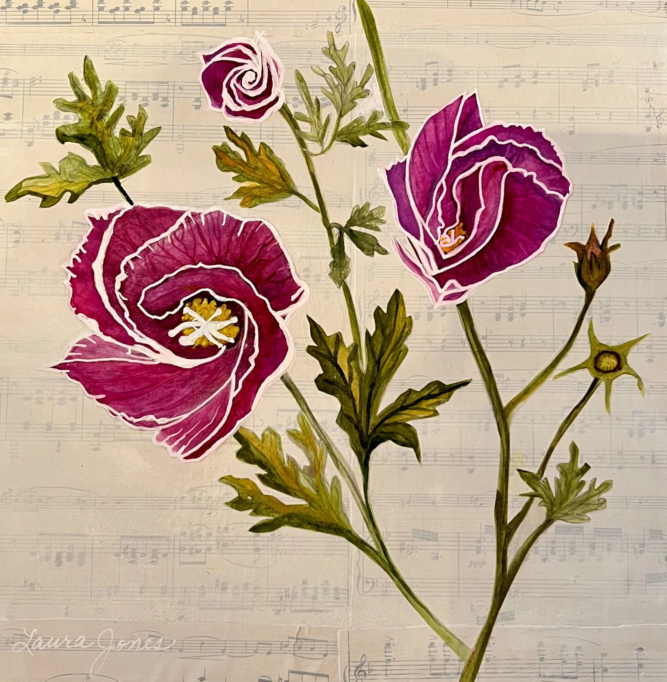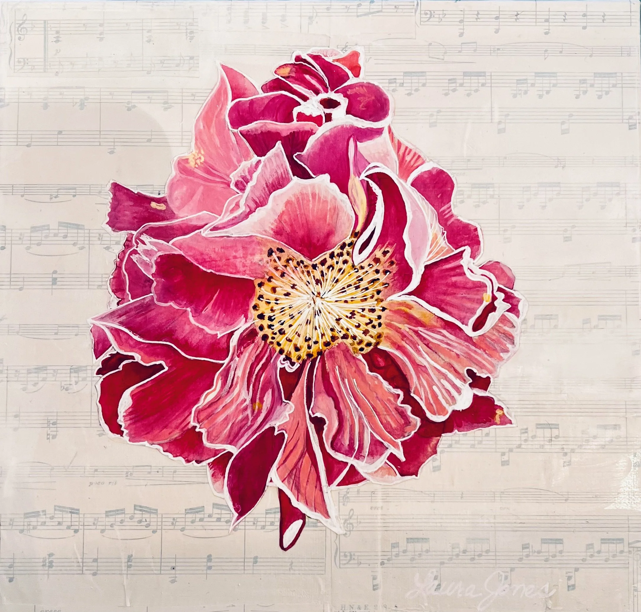 Isn’t She Lovely. Original Watercolor Collage Painting. 12x12, on canvas. Peony flowers are among my favorite flower. They are a beautiful creation. This flower is the one that started my recent journey through the flower fields. Creating my own image to use in this collage was so much fun. Vintage music paper was used to cover the canvas and then I painted it with a white wash and glaze. Many layers and many petals. This Peony has a new home but she started a new project that I will be sharing with you. This will be available as a Fine Art print and select goods. Maybe even an online or in-person class.